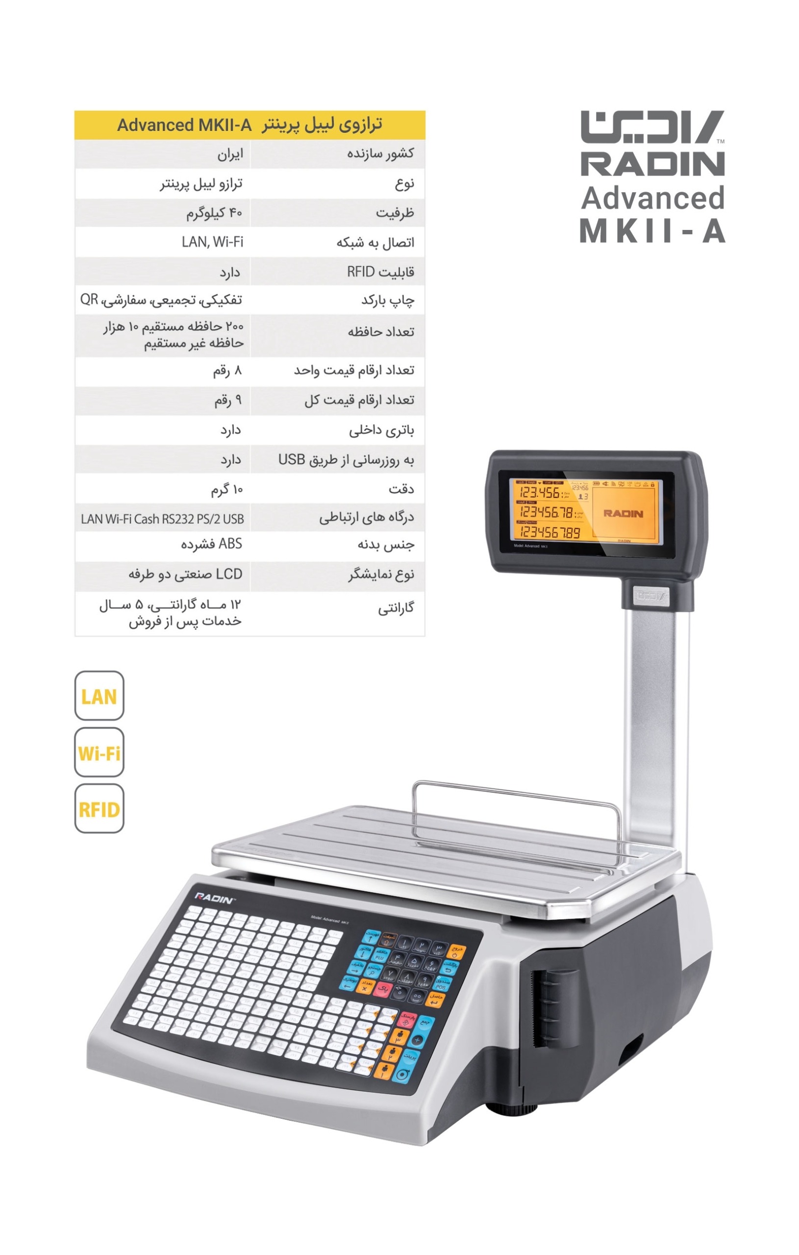 مشخصات فنی ترازو لیبل پرینتر ستوندار رادین MKII 40 کیلوگرم